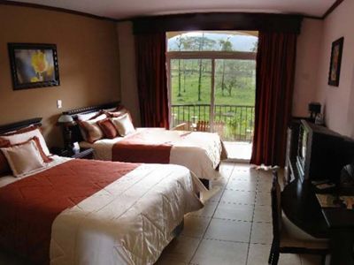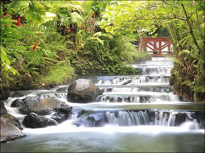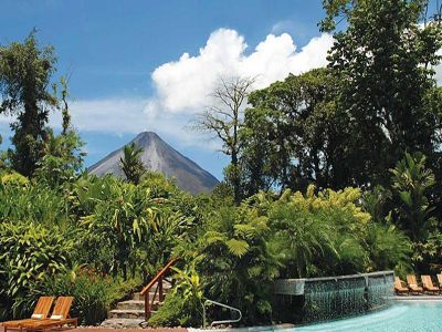 Arenal Kioro offers a fabulous place with a natural viewpoint to the Arenal Volcano. The hotel has 27 acres of undulating land, surrounded by two streams (La Palma and Kioro) with crystalline waters that begin to flow in the Arenal Volcano National Park. It has two paths where plant species are identified. Besides, private thermal springs surrounded exuberant gardens for our customer's delight. The hotel has 53 suites, 11 with one king bed and a daybed and 42 with two Queen bed and a day bed, with two terraces with the best panoramic volcano and mountain view , hydro-massage, air conditioning, safe deposit box, minibar, coffee maker, hot water, direct dialing telephone, satellite television, hair dryer, key card, safety locks, internet connections. Heliconias Restaurant offers exquisite dishes elaborate by the chef with original recipes based on international food with specialties on meats and sea food. Neidin Spa is a little nest where